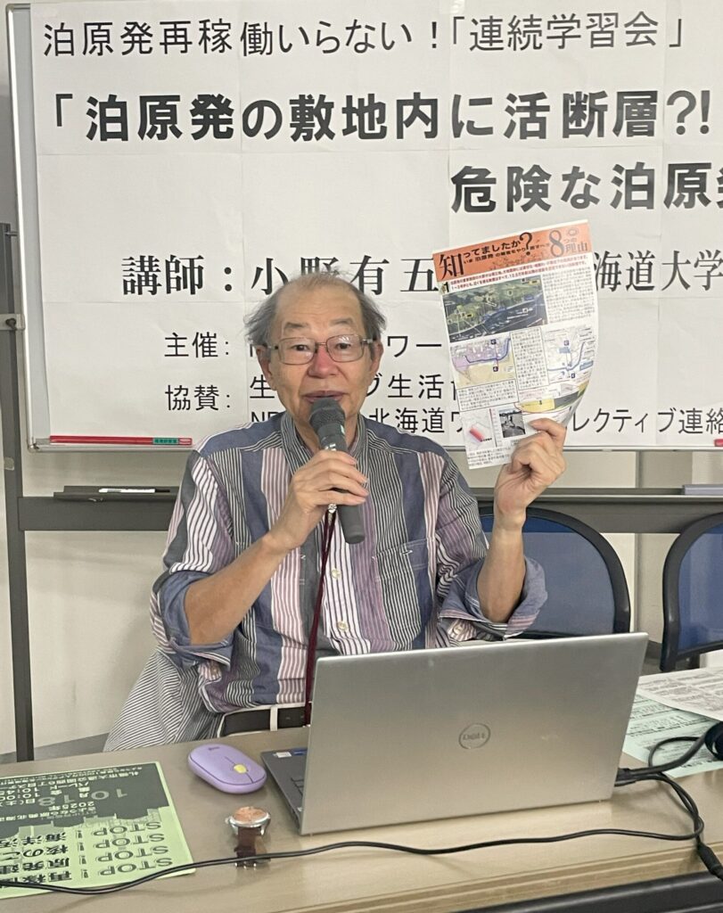 …講師の小野有五さん(北海道大学名誉教授)は北電が調査し、規制委員会が容認した泊原発の審査結果の問題点を指摘されました。地震性隆起については「積丹半島の西海岸には継続して地震隆起してきた地形があることから、その近くにあるはずの海底活断層の調査は音波探査だけではなく、変動地形学の手法で見直すべき」、断層については「泊原発2号機の直下を通るF4断層の審査では断層露頭の調査をせず、標高、位置の異なる地点の地層と対比して、活断層ではないと否定した」、火山については「非火山性の部分だけを見て、恣意的な調査を繰り返し火山性を否定した」などです。