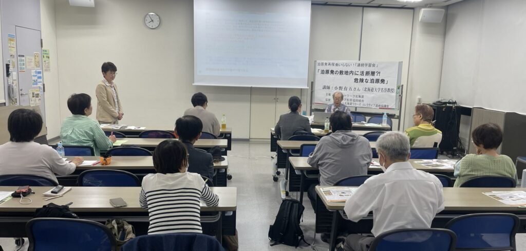 …北海道電力泊原発3号機について、原子力規制委員会は、2025年7月30日、再稼働の前提となる安全審査を終え正式合格としました。北電は、現在、泊原発の安全対策等に関する説明会を道内29市町村で開催しています。知事は泊原発の再稼働については、道議会や関係自治体、道民の声を踏まえて総合的に判断するとしています。原子力災害避難計画や原発敷地内の活断層、さらに原発による放射性物質による健康被害の問題点を共有し、「泊原発再稼働 いらない!」の声をともにあげていくため「連続学習会」を開催しました。
