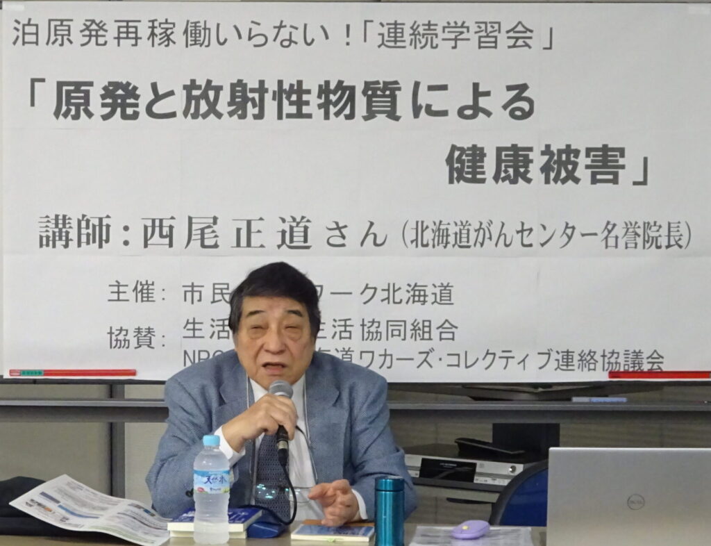 …講師の西尾正道さん(北海道がんセンター名誉院長)は、長年放射線によるがん治療を実践してきた立場から「がんは生活習慣病ではなく生活環境病である」とし、大気圏内核実験が始まった頃から小児がんが増えたことや放射性セシウム、トリチウムの体内動態など、ガラスバッジなどでは測定できない内部被ばくの影響について指摘。また、原発を動かせば事故が起きていなくてもトリチウムが排出されることに触れ、「原発を動かすために内部被ばくを過小評価することは許されない。広く知らされず、伏せられたままの情報がたくさんある。知ることから始めなければならない」と話されました。